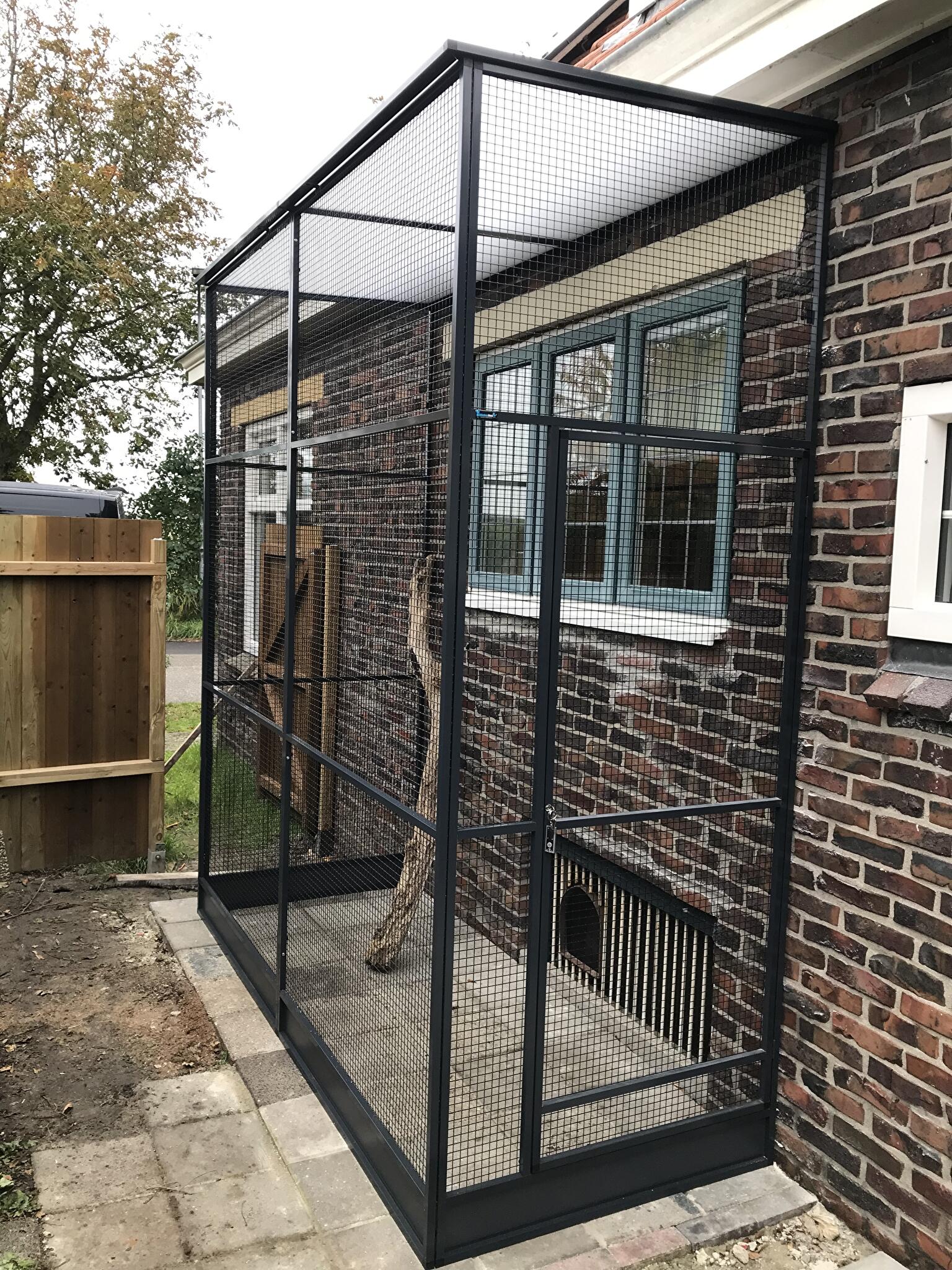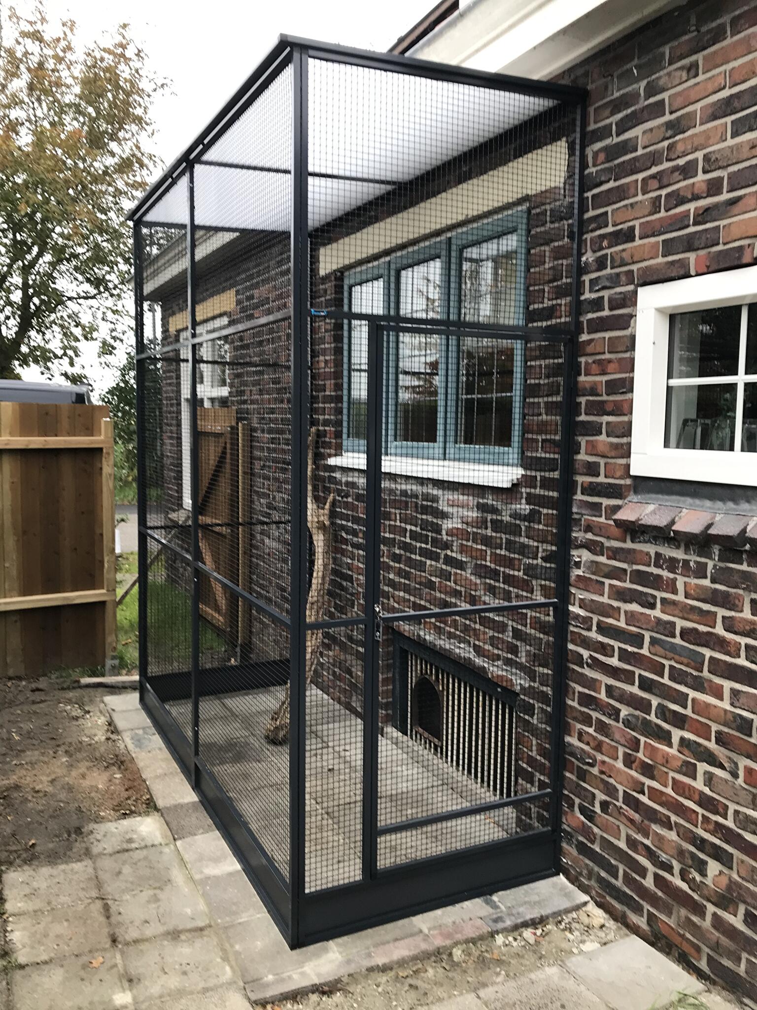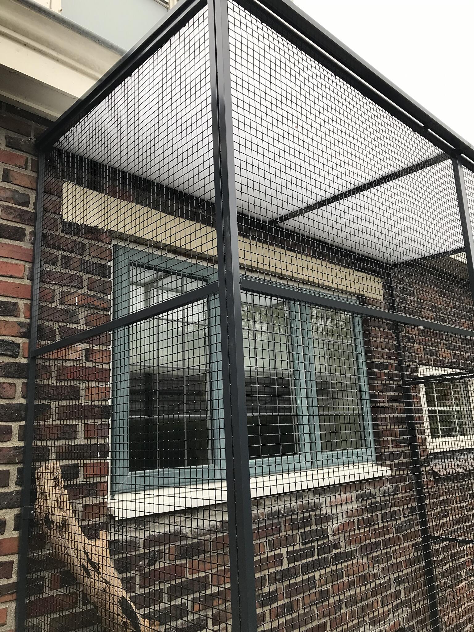 Deze ren is tegen een raam gebouwd zodat de katten er zelf in en uit kunnen lopen van antraciet aluminium met zwart gepoedercoat gaas